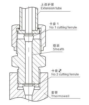 熱電偶(阻) 浸在介質(zhì)中使用時(shí),一旦其套管開裂或斷裂,介質(zhì)在壓力作用下就會沿杻熱電偶(阻)外溢, 從而引起事故;在套管與上保護(hù)管之間設(shè)用雙卡套,擰緊螺絲與螺帽可達(dá)到雙層防諞效果,杜絕因套管斷 裂而導(dǎo)致的泄諞。